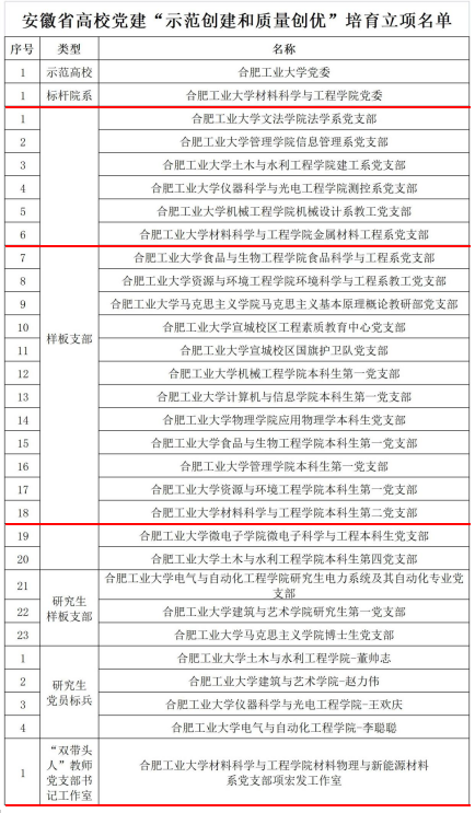 在此次党建示范创建和质量创优工作中获得佳绩。亚洲色吧党委入选全省高校党建工作“标杆院系”,金属材料工程系教师党支部、本科生第二党支部入选全省高校党建工作“样板支部”。同时,亚洲色吧材料物理与新能源材料系教师党支部获批安徽省高校“双带头人”教师党支部书记工作室。